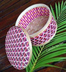 色とりどりに編み込まれた繊細な竹細工。 様々な柄がございます。 これだけでもカンボジアの良いお土産になりますが、ティータイムではこの竹籠にハーフサイズの“ノムトムムーン”をお詰め致しました😆