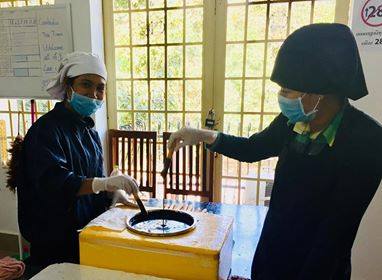 our popular product, Chocolate Nomutomumu-n. every staff cooperate with making it. They are so efficient that they can make Nomutomumu-n more than 100 pieces a day. We hope that our product remind of memories in Cambodia.
